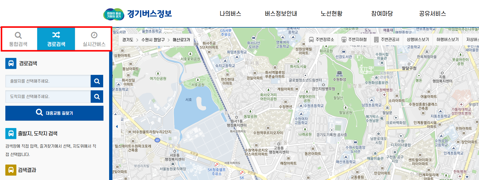 경로검색을 선택하시면 출발지와 도착지를 입력해서 버스노선을 찾을 수 있습니다.