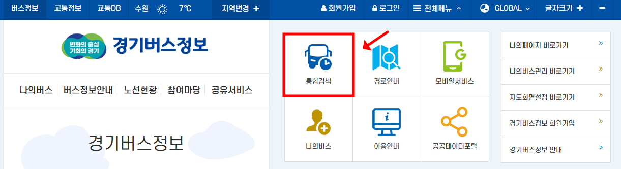 경기버스노선 홈페이지 통합검색 방법입니다.