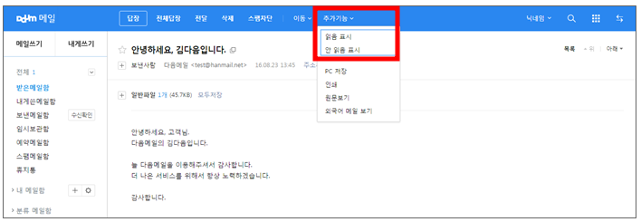 2. 메일 읽기 중 상단툴바의 추가기능에서 읽음/ 안읽음표시 선택가능