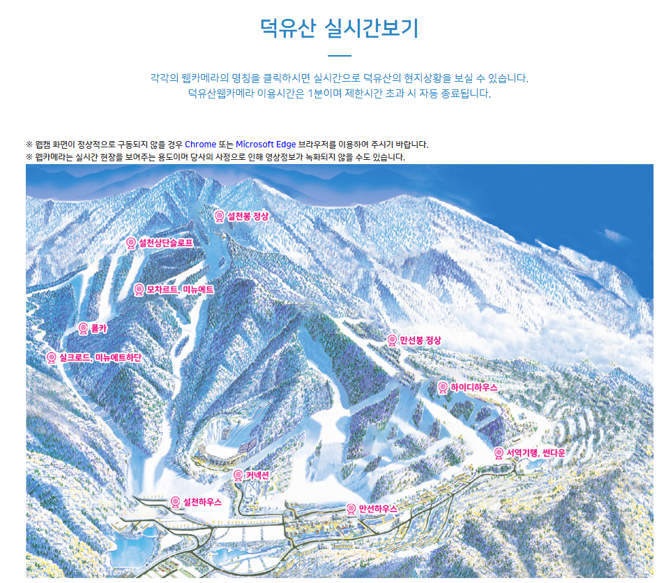 덕유산 국립공원 실시간 CCTV는 아름다운 덕유산을 여행하고자 할 때 유용하게 사용할 수 있습니다. 덕유산 국립공원 내의 무주리조트는 자연을 느낄 수 있는 종합휴양지로 사계절 인기가 많습니다.