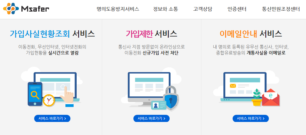 엠세이퍼(Msafer)홈페이지는 명의도용을 방지하기 위한 서비스입니다. 무료로 이용할 수 있으며 명의도용으로 인한 피해를 사전에 방지하거나 예방할수 있으며 명의도용시 빠르게 대처할 수 있습니다
