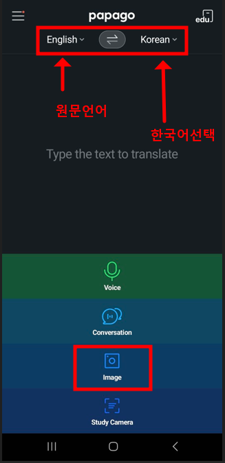 파파고 번역기 앱을 실행하시면 다음과 같은 화면을 보실수 있을텐에요, 언어를 선택해주시고 '이미지' 아이콘을 탭합니다.