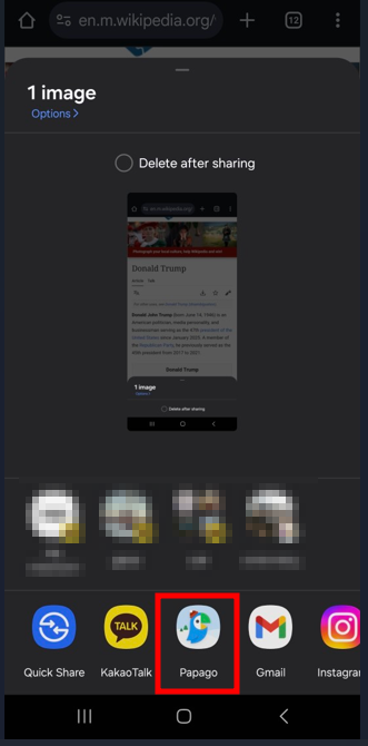 공유앱에서 파파고를 선택하면 자동으로 번역을 실행합니다. 몇초후 결과를 확인해보세요